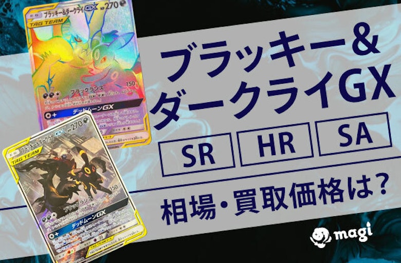 現在非常に人気が高くなっている『ポケモンカード』 子供~その親の世代まで幅広い層に親しまれており、ここ数年で国内タイトルの中でもトップクラスの人気になりました。 そんなポケモンカードの中でも人気ポケモンや幻・伝説ポケモンは特に高額で取引されています。 そこで今回は『ブラッキー&ダークライGX』に焦点を当ててSR/HR/SAの相場を特徴と共にご紹介していきます。 売買する際の参考になれば幸いです。