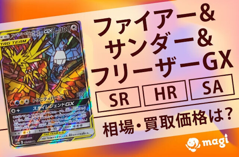 現在非常に人気が高くなっている『ポケモンカード』 子供~その親の世代まで幅広い層に親しまれており、ここ数年で国内タイトルの中でもトップクラスの人気になりました。 そんなポケモンカードの中でも人気ポケモンや幻・伝説ポケモンは特に高額で取引されています。 そこで今回は『ファイアー&サンダー&フリーザーGX』に焦点を当ててSR/HR/SAの相場を特徴と共にご紹介していきます。 売買する際の参考になれば幸いです。