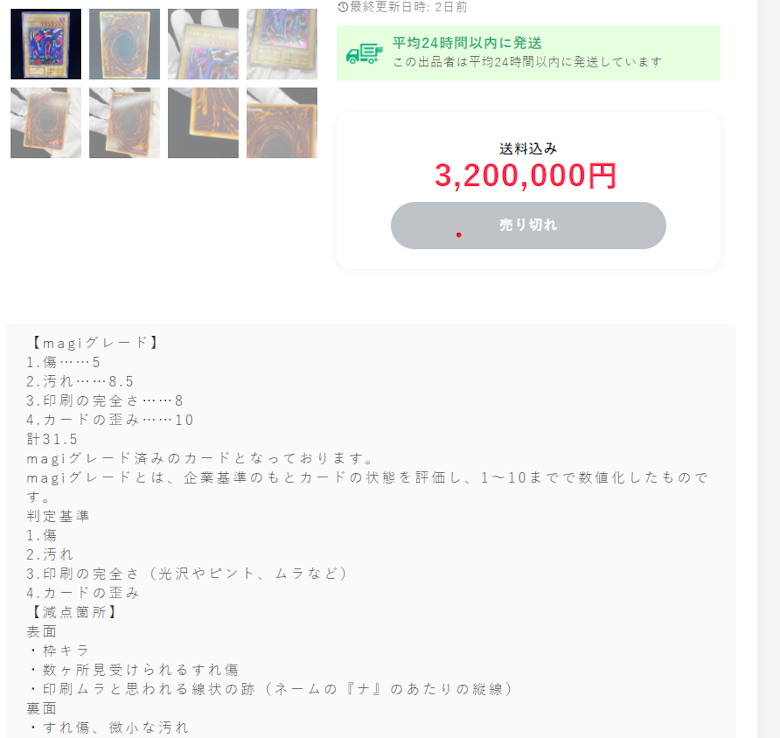尚、当社で付与するmagiグレードについては、必要に応じて行いますが、必ず行うという保証は出来かねます。グレードが高いスコアでつかないケース、また販売価格が10万円未満の場合に人的工数からグレード付与が難しいと判断する場合に当社からお断りさせていただきます。