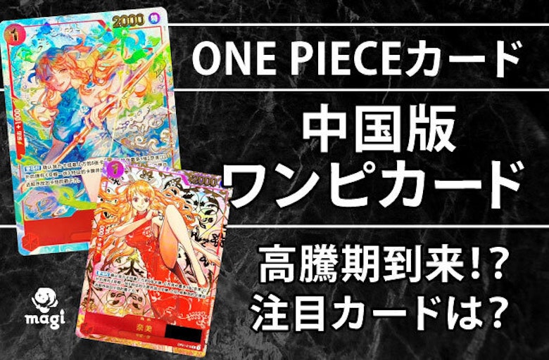 (引用:ONE PIECEカードゲーム公式サイト(中国) 様) 日本で大注目のONE PIECEカードゲーム。 そんなワンピースカードの中国版(簡体)が今注目を集めています。 中国にて限定販売された1st anniversary setに収録された通称赤ナミ・青ナミの高騰を皮切りに、中国限定配布のプロモーションカードを筆頭に、様々なカードが日本の市場で活発に取引されるようになっています。 今回はそんな中国版(簡体)ワンピースカードの中でも注目カードをご紹介いたします。 ※中国版「1st anniversary set」に関しましては「ワンピースカード中国版 赤ナミ・青ナミの相場が高騰・PSA10買取価格」を御覧ください。