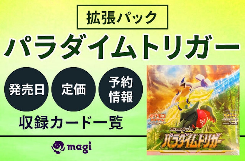 2022年9月2日に発売したポケモンカードゲームの強化拡張パック最新弾『白熱のアルカナ』が最近では話題になりました。 そして遂に、新弾として2022年10月21日に発売される拡張パックの最新弾『パラダイムトリガー』の収録カードが公式サイトにて公開されています。 『白熱のアルカナ』にて新登場した「セレナ」の収録も話題になりましたが、今回はどの様なカードが収録されるのでしょうか。 ここからは早速、『パラダイムトリガー』で初登場する新規カードについてご紹介させて頂きます。 最後までお付き合いいただけますと幸いです。 ※本記事で紹介している全ての情報は執筆時のものとなり、内容が変更している可能性がございます。買取価格についても記載日公開した日に限り有効であり、それ以降の有効性を保証するものではありません。