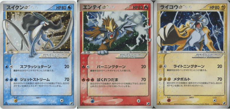 (引用:ポケモンカードゲーム公式ホームページ 様) 発売日:2005年4月8日 希望小売価格 300円(税抜き) カード/11枚(うち、キラカード1枚) 『金の空、銀の海』にはジョウト三犬として名高い「エンテイ」、「スイクン」、「ライコウ」が☆(スター)として収録されています。
