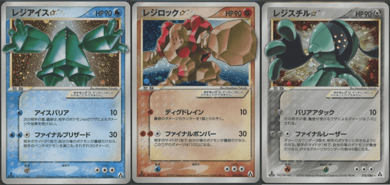 (引用:ポケモンカードゲーム公式ホームページ 様) 発売日:2005年6月30日 希望小売価格 300円(税抜き) カード/11枚(うち、キラカード1枚) 『まぼろしの森』にはホウエン準伝説の「レジアイス」、「レジロック」、「レジスチル」が☆(スター)として収録されています。