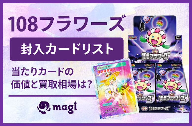 magiではこれまで様々なトレーディングカードの話題を取り上げてまいりました。 今回はMurakami.Flowers Collectible Trading Cardの話題の中から108フラワーズの封入カードリスト・当たりカードの価値・買取価格一覧についてご紹介させて頂きます。 最後までお付き合いいただけますと幸いです。 ※本記事で紹介している全ての情報は執筆時のものとなり、内容が変更している可能性がございます。買取価格についても記載日公開した日に限り有効であり、それ以降の有効性を保証するものではありません