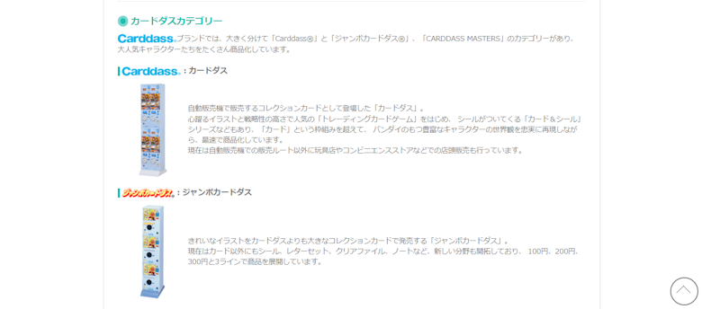 (引用:カードダスドットコム 様) 「カードダス」は1988年にバンダイより販売開始されたトレーディングカード専用自動販売機です。 カードダスではSDガンダムやドラゴンボール、セーラームーン、エヴァンゲリオンなど、数々の国民的アニメ・漫画がトレーディングカード化されて玩具売場はもちろん、スーパーや駄菓子屋などいたる所にカードダスが設置されることで爆発的に普及しました。 誕生から約36年が経過した現在でも、多くのアニメや漫画、キャラクターが続々とトレーディングカード化されており、カードコレクターのみならず幅広い層から支持されるトレカ自販機です。