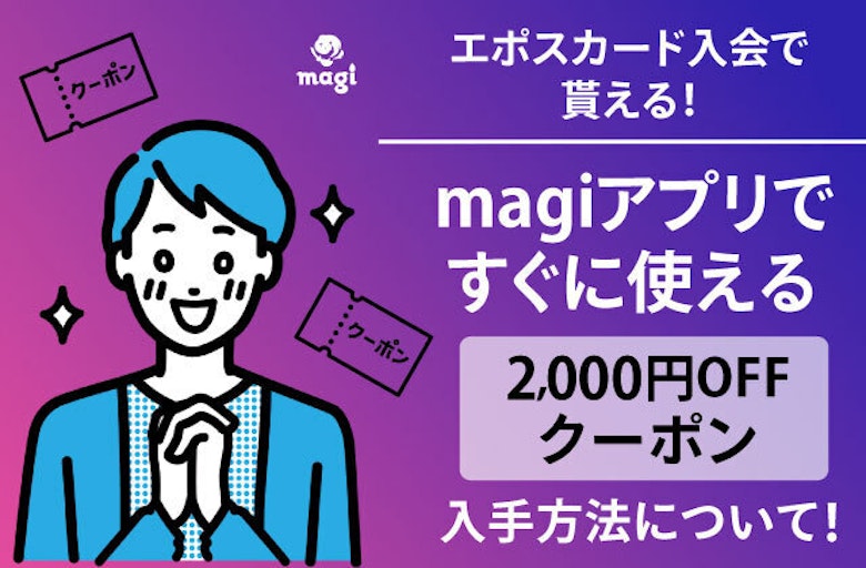 現在、エポスカードのお申し込み完了後、「magi 公式アプリ・ECサイト」ですぐに使える2,000円OFFクーポンをプレゼントしています。 入会金・年会費は永年無料で、エポスカードのお申し込み完了後、エポスかんたん決済で新規入会特典をすぐにご利用いただけます。