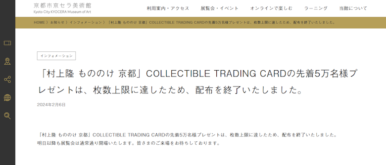 There will be a total of 24 types of cards—12 different kinds, each with a… pic.twitter.com/yvIWbbrI11なお2月6日に5万枚全ての配布が終了した旨がアナウンスされています。After we recently announced the distribution of trading cards to the first 50,000 visitors to the Takashi Murakami Mononoke Kyoto exhibition at the Kyoto City KYOCERA Museum of Art, we have received a tremendous response and many inquiries.