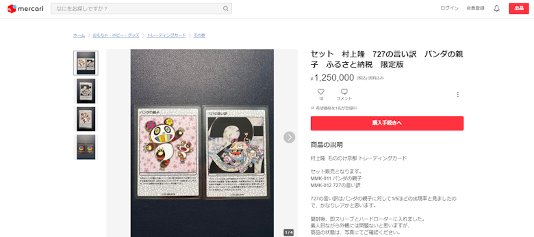 (引用:ふるさとチョイス 様) 「村上隆 もののけ 京都」の開催及び京都市美術館開館90周年を記念し、京都市のふるさと納税にて村上隆氏デザインによる「COLLECTIBLE TRADING CARD」付きの「京都市ふるさと納税特別返礼品プラン」が実施されています。 全11プランで寄付額は1万円〜10億円まで。 全12種類でふるさと納税でしか手に入れることのできない限定カードとなっているだけでなく、種類によって出現率が異なり、かつ特殊な印刷加工をした限定品も用意されていることから、執筆時(2月7日)現在メルカリ上ではかなり強気な値段設定で出品されています。