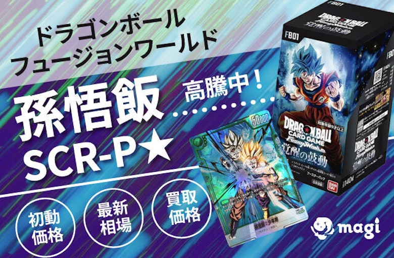 収録されている『覚醒の鼓動』は発売したばかりで、再販を含めこれからも流通量が増加することが予想されますが、孫悟飯:少年期SCR-P★はコレクション需要も高く、需要の上昇も予想されます。様々なトレーディングカードの買取を行っている「magi」店舗一覧