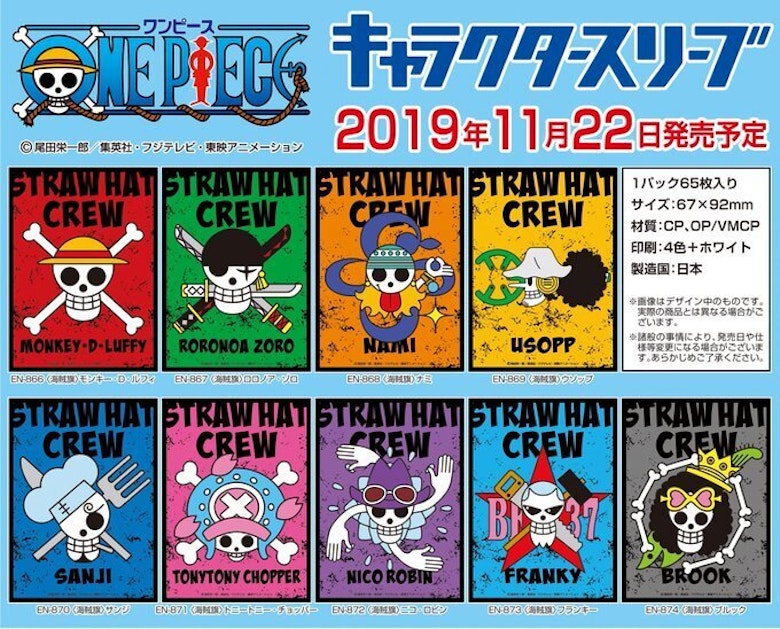 2019年11月にONE PIECEライセンス商品を多く取り扱う株式会社エンスカイより発売された麦わらの一味(発売当時、原作・アニメ共に正式加入前のジンベエを除く)の海賊旗をデザインしたキャラクタースリーブが発売されました。 ワンピースカード発売前の商品でありながらスリーブサイズが一致しており、枚数も65枚入りとワンピースカードの仕様に合致しているため、密かにワンピースカードユーザーの注目を集めています。「キャラクタースリーブ」