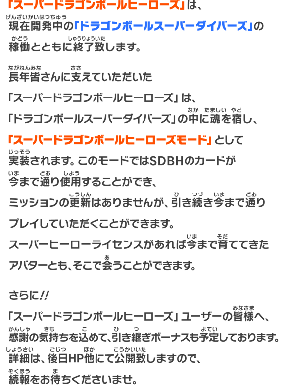(引用:スーパードラゴンボールヒーローズ公式サイト 様) 2024年5月8日、スーパードラゴンボールヒーローズ公式X(旧Twitter)にて翌9日に重大発表を行う旨のポストが行われ、界隈では新筐体のシルエットが公開されていた事から新章突入などの新サービス開始説からサービス終了説まで、様々な憶測が飛び交いました。