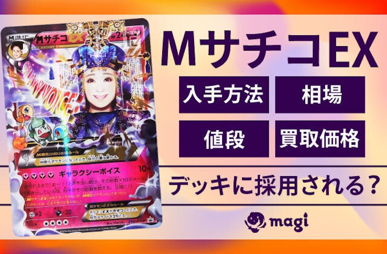 2022年5月現在も人気を博しているポケモンカードゲーム 。 今回はそんなポケモンカードのMサチコEXの入手方法・相場・値段・買取価格は?デッキに採用されるかについてご紹介させて頂きます。 ※本記事で紹介している全ての情報は執筆時のものとなり、内容が変更している可能性がございます。買取価格についても記載日公開した日に限り有効であり、それ以降の有効性を保証するものではありません。