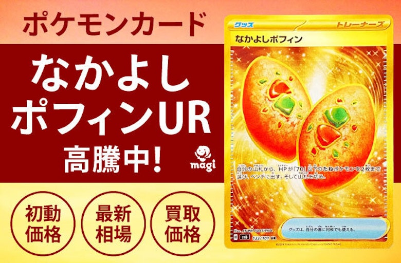 いかがでしたでしょうか、「なかよしポフィンUR」について調べる際の参考になりましたら嬉しい限りです。 今後もポケモンカードゲームに関連した記事も更新していきますので、また覗いて頂けますと幸いです。 今回も最後までお付き合い頂きありがとうございました。 地方の方等は、ネットでの買取を行っているところに相談するなどしてできるだけ高く買い取ってもらいましょう。 magi買取事務局では一般的な買取金額より高く買取金額を設定している場合がほとんどですので、是非無料で査定依頼を出してください。
