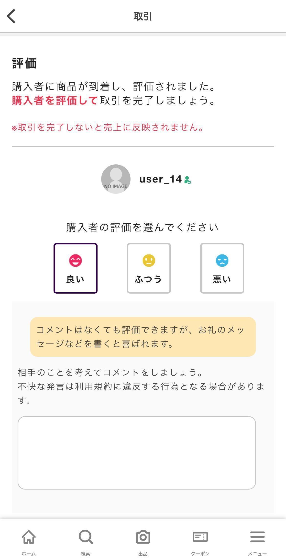 購入者に商品が届き、受取評価をされると通知がくるので、取引画面で購入者を評価しましょう。