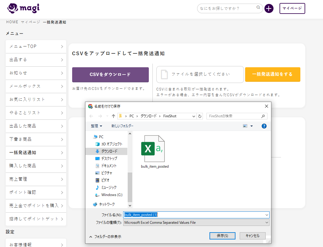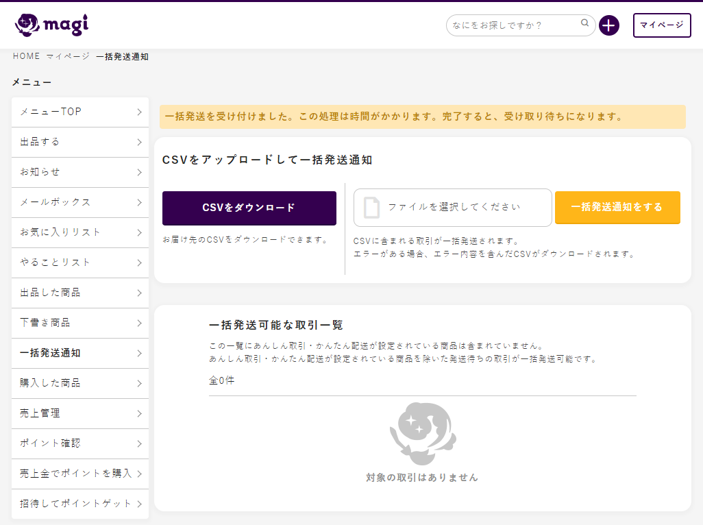 1.「マイページ」からメニュー一覧にある「一括発送通知」を選択しましょう。