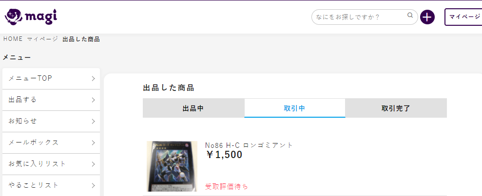 2. 購入された商品が一括発送可能な取引一覧に表示されていることを確認しましょう。※あんしん取引・かんたん配送が設定されている商品を除いた発送待ちの取引が一括発送可能です。