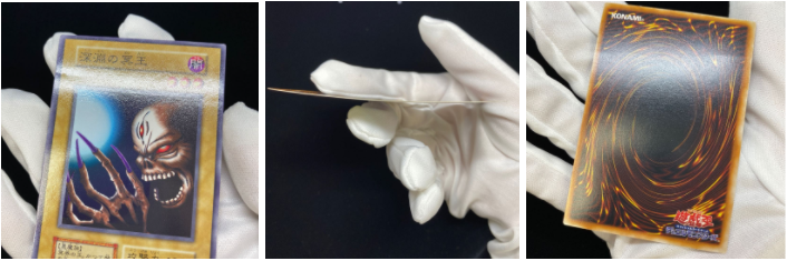摩耗……プレイ時にスリーブでこすれ側面や表面にダメージがある状態です。全体的にすれたような汚れ、側面の毛羽立ち等が挙げられます。 枠キラ……遊戯王初期に顕著です。初期傷の類もありますが、摩耗によって大きくきらめいているものもあります。