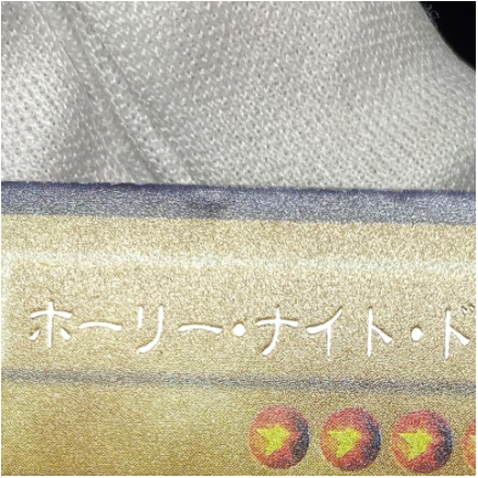 (遊戯王)一直線であることが多いです。ホログラフィックレアには良く入っています。最近のものでは、角に裁断時にヨレが出るものも見受けられます。海外版は初期傷ありがデフォルトです。汚れに見えるものの初期傷です(4~6期に顕著)。打痕もあれば地面に擦り付けたような擦り傷も多くあるものもあります。
