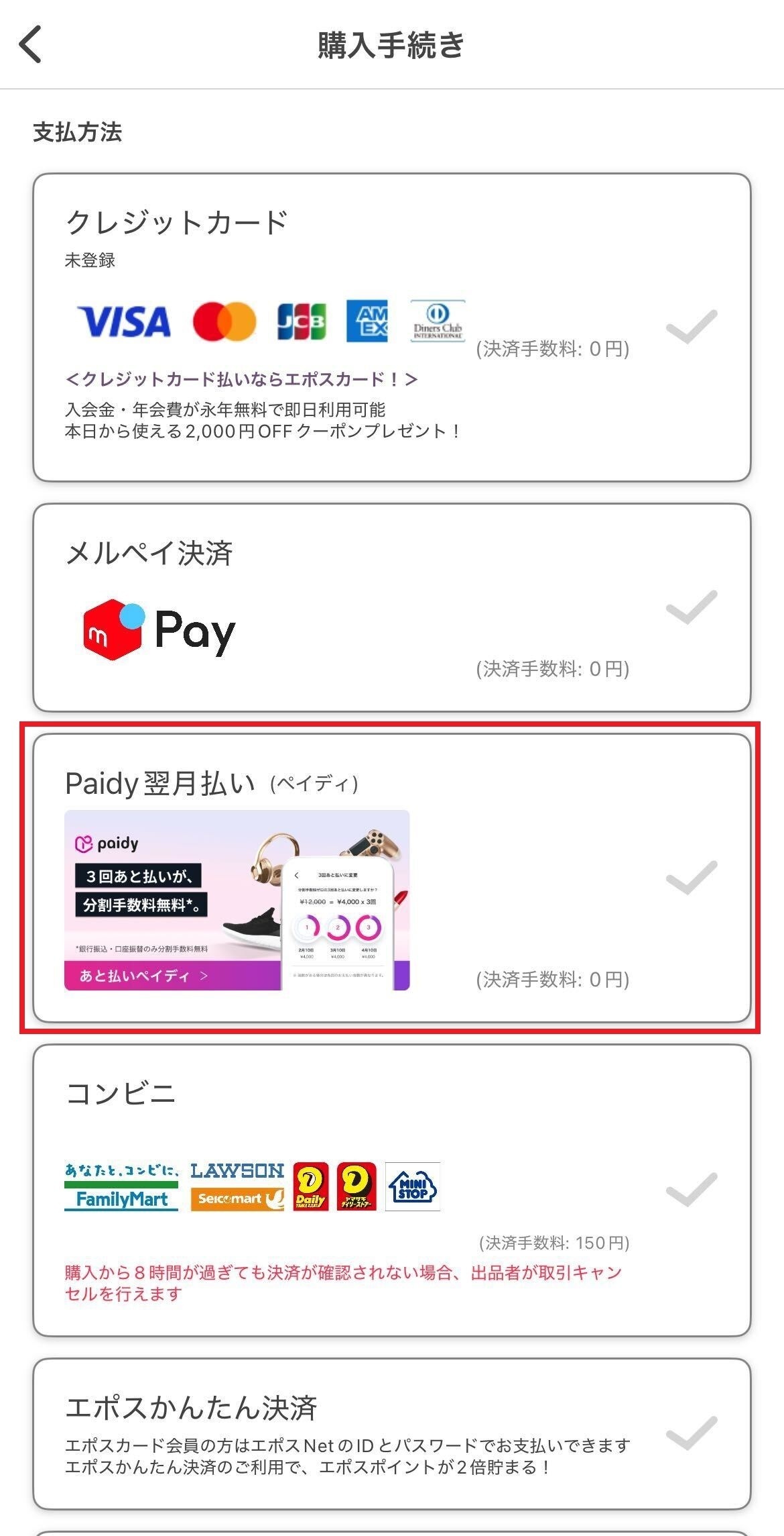 購入時、購入手続き画面の「支払い方法」から「Paidy翌月払い (ペイディ)」を選択してください