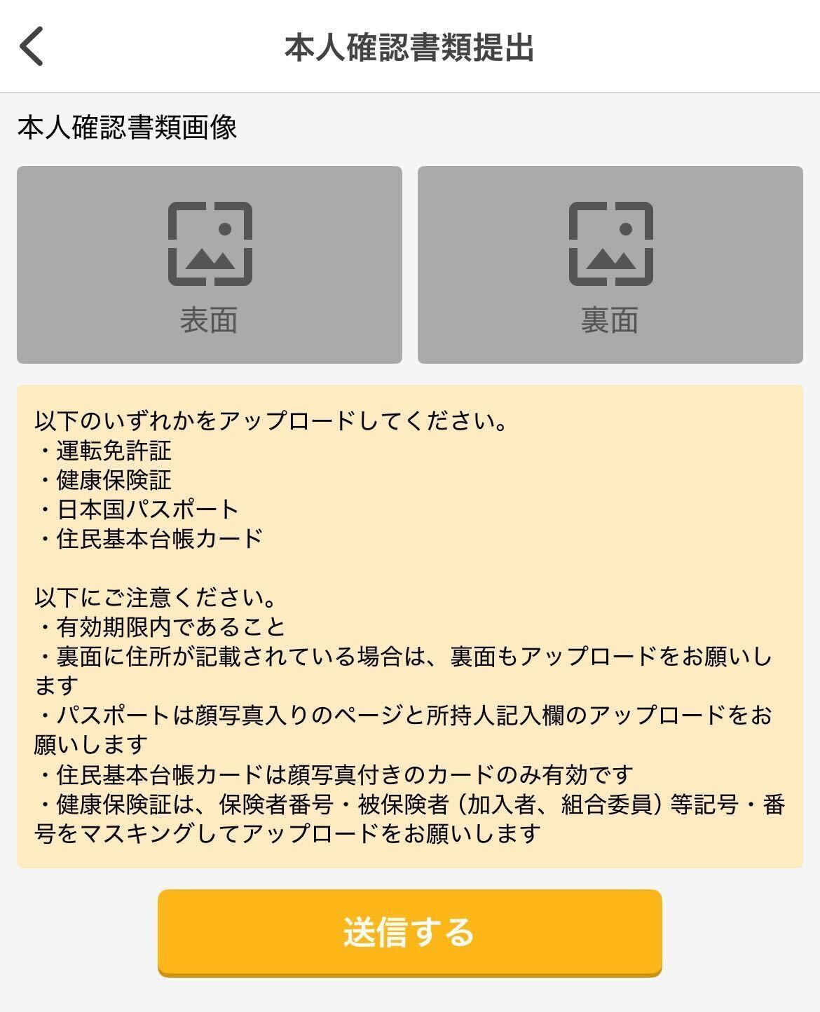アプリのメニュー>設定>本人確認書類提出 から、こちらより本人確認書類の提出ができます。