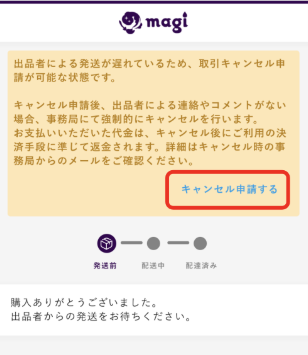 取引対象商品の出品情報に指定された発送日目安から48時間が経過しても発送通知が行われない場合、購入者より取引キャンセル申請が可能となります。