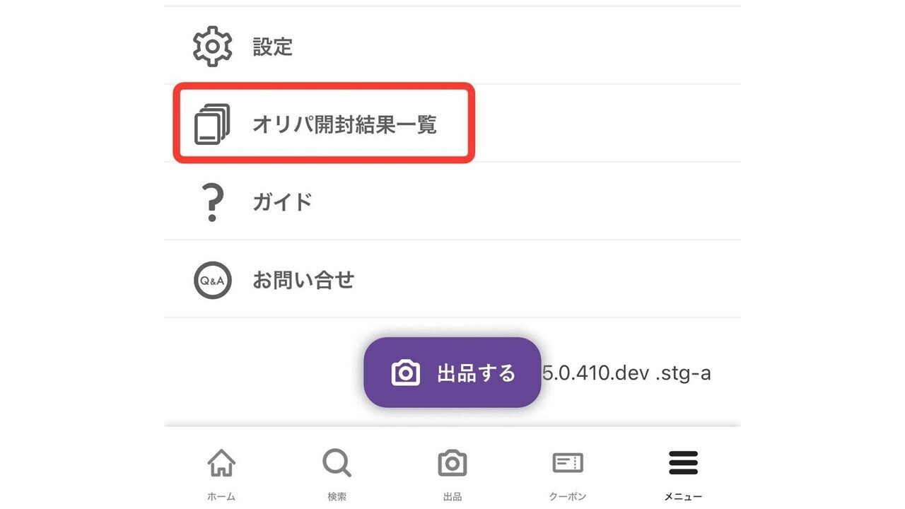 オリパ購入後は、メニューのオリパ開封結果一覧から当選したカードを確認できます。当選したクーポンはオリパ開封結果一覧には表示されません。アプリのクーポン一覧をご確認ください。