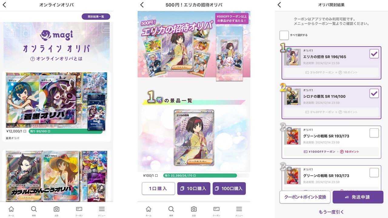 オンラインオリパは、オンライン上でオリパを引き、その場で開封結果がわかるオリパです。カードもしくはmagiの取引で使えるクーポンが当たります。