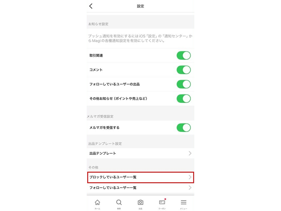 1. アプリ版magiでメニュー>設定>ブロックしているユーザー一覧を開きます