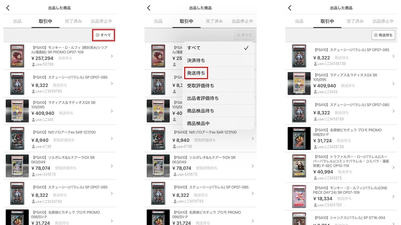 いつもmagiをご利用いただき、誠にありがとうございます。 magi運営事務局でございます。 iOSアプリ版magiにて、取引中の商品を絞り込みが可能になりました! メニュー>出品した商品>取引中を開き、右上の「すべて」をタップすると、取引ステータスで商品を絞り込むことができます。 ※現在Web版、iOSアプリ版magiで利用可能です。アプリを最新版にアップデートしていただくと、ご利用いただけます。 発送待ちの商品一覧を確認したいときなどにご活用ください。 ご不明点などございましたら、お問い合わせよりお願いいたします。 お問い合わせは、アプリメニュー>「お問い合わせ」から行えます。 引き続き、magiをよろしくお願いいたします。