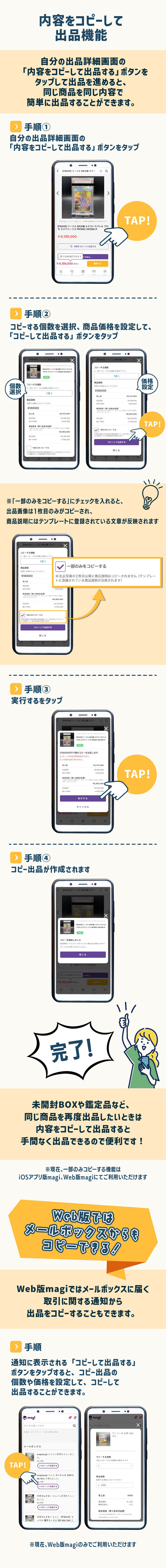 いつもmagiをご利用いただき、誠にありがとうございます。 magi運営事務局でございます。 知っておくと便利なmagiの出品コピー機能についてご紹介いたします。ご不明点などございましたら、お問い合わせよりお願いいたします。 お問い合わせは、アプリのメニュー>「お問い合わせ」から行えます。 引き続き、magiをよろしくお願いいたします。