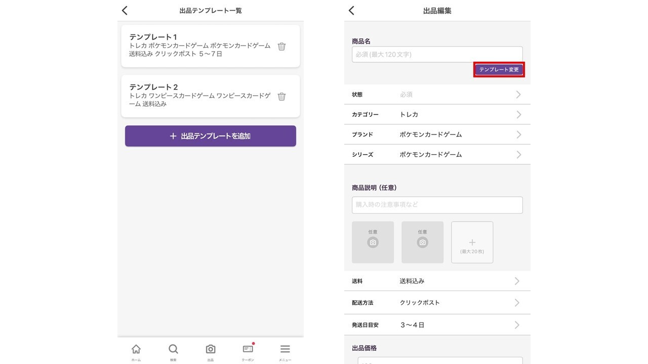 出品時に適用するテンプレートを変更したい場合は、テンプレート変更ボタンをタップしてください。