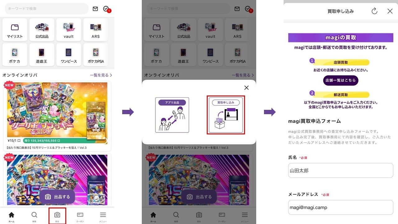 いつもmagiをご利用いただき、誠にありがとうございます。 magi運営事務局でございます。 iOSアプリ版magiにて、簡単に郵送買取を申し込めるようになりました! ※現在、最新版のiOSアプリ版magiのみでご利用可能です。アプリ下部フッターの「売る」をタップすると以下の2つから選べるようになります。 ・アプリ出品 ・買取申し込み 「アプリ出品」を選択すると、これまで通り出品フォームへ進むことができます。 「買取申し込み」を選択すると、買取申込フォームが表示され、郵送による買取をお申し込みいただけます。 iOSアプリを最新版にアップデートして、ぜひご活用ください。 ご不明点などございましたら、お問い合わせよりお願いいたします。 お問い合わせは、アプリメニュー>「お問い合わせ」から行えます。 引き続き、magiをよろしくお願いいたします。