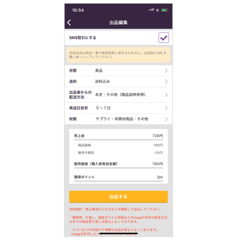 ・出品時に「SNS取引用出品」として出品した商品は、magiの商品一覧や検索結果に表示されず、URLを知っているお客様のみが閲覧可能となります