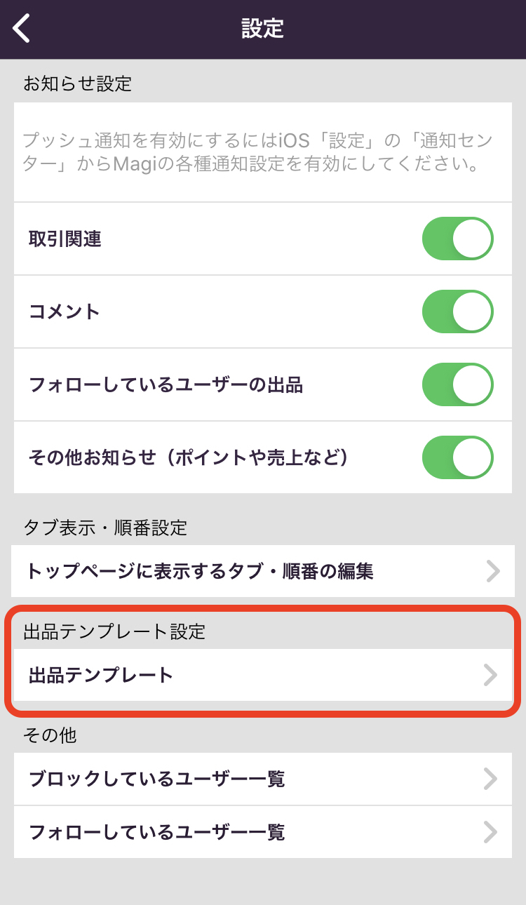 いつもmagiをご利用いただきありがとうございます! magi運営事務局でございます。 今回は出品する際に使える便利な機能をご紹介いたします! 「出品テンプレート」機能はご存知でしょうか? 出品テンプレートとは、出品に必要な情報をあらかじめテンプレートとして登録することによって、出品の際の手間を省くことができるというものです。 登録できる情報は以下の通りです。 ・カテゴリ ・送料込み/着払い ・配送方法 ・発送日目安 ・状態 ・枚数 もちろん、テンプレートを登録していても出品ごとに内容は変更することが可能です。 たくさん出品を行っている方にとってはとても便利な機能なので、ぜひご利用ください。 出品テンプレートの設定は、アプリ左上「≡」>「設定」から行えます。ご不明点などございましたら、お問い合わせよりお願いいたします。 お問い合わせは、アプリ左上「≡」>「お問い合わせ」から行えます。 引き続き、magiをよろしくお願いいたします。 magi運営事務局