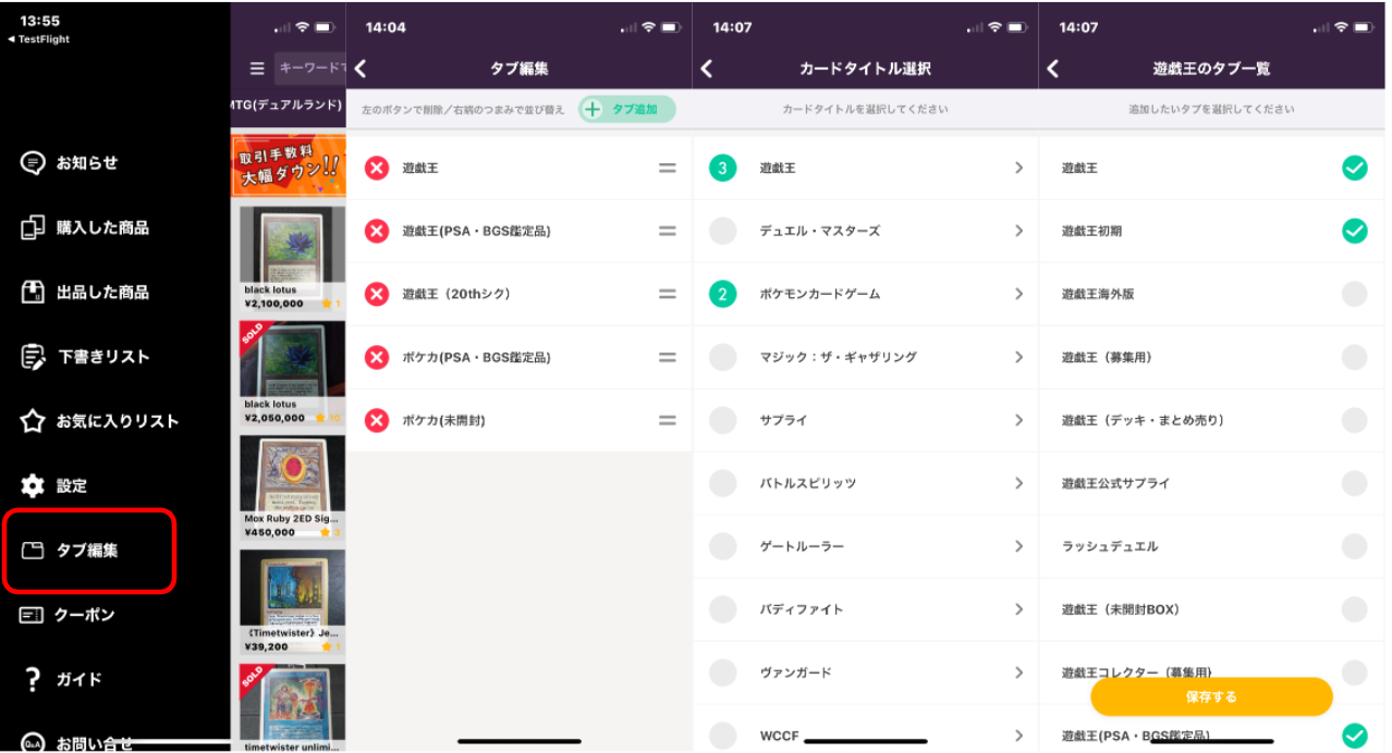 ・アプリ左上のメニュー内「タブ編集」からタブ編集画面を開くことができます。
