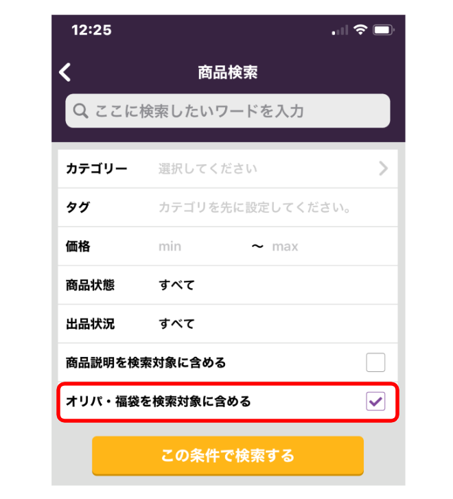 検索フォームを開いたデフォルト状態では、「オリパ・福袋を検索対象に含める」のチェックボックスにチェックは入っていません。