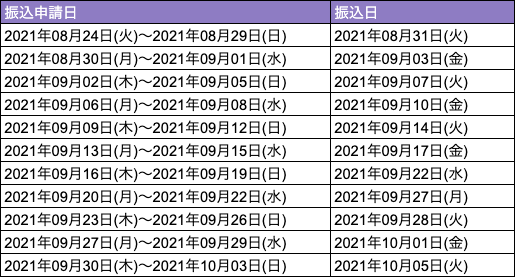 いつもmagiをご利用いただき、誠にありがとうございます。 magi運営事務局でございます。 2021年8月下旬より、以下のとおり「売上金振込スケジュール」を改定いたしますので、お知らせいたします。 ================================ 売上金の振込スケジュールを「1週間に1回」から「1週間に2回」へ変更いたします 変更適用日時:2021年8月下旬 ※ 詳細は以下の振込スケジュールをご確認ください。 【詳細】 ・売上金の引き出しを行える頻度が以下のとおり、週に1回から2回へ変更となります。 月曜日〜水曜日の振込申請→翌金曜日にお客様の口座へ着金 木曜日〜日曜日の振込申請→翌火曜日にお客様の口座へ着金 ※振込日または振込日前日が祝日の場合、銀行営業日の都合上、翌営業日への変更になります。 【当面の振込スケジュール】なお、振込スケジュールは変動になる場合がございます。振込申請をされる際に、必ずmagiのアプリ・web上に表示される振込スケジュールをご確認ください。 ================================ ご不明点がございましたら、お問い合わせよりご連絡ください。 お問い合わせは、アプリ左上メニュー→「お問い合わせ」からご利用いただけます。 引き続き、magiをよろしくお願いいたします。