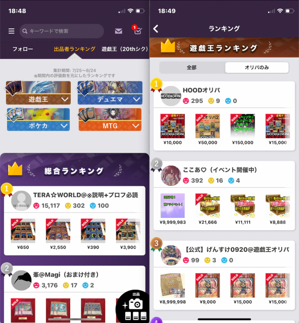 いつもmagiをご利用いただきありがとうございます! magi運営事務局でございます。 本日、iOS(iPhone)アプリ版magiにおいて 出品者ランキング機能 をリリースいたしました。 本機能で表示されるランキングは、直近1ヶ月間の「良い」評価の件数を元にしたものとなっており、遊戯王、ポケモンカード、デュエル・マスターズ、MTGの4カテゴリ及びそれぞれのカテゴリのオリパのみのランキングが閲覧可能です。 出品者ランキングは、アプリトップの「フォロー」タブの右に表示されます。【出品者ランキング機能の詳細】 ・ランキングの基準は、直近1ヶ月間の「良い」評価の件数となっており、1日に1回更新されます。 ・ランキングの集計対象期間は、出品者ランキングタブの上部に表示されています。 ・ランキングの基準や集計対象期間等、仕様については予告なく変更となる場合がございます。 ※こちらの機能は現時点ではiOS(iPhone)アプリ版magiにおいてのみ、ご利用可能な機能となっております。Androidアプリ版、web版magiでは現在はご利用いただけません。 ご不明点などございましたら、お問い合わせよりお願いいたします。 お問い合わせは、アプリ左上「≡」>「お問い合わせ」から行えます。 引き続き、magiをよろしくお願いいたします。