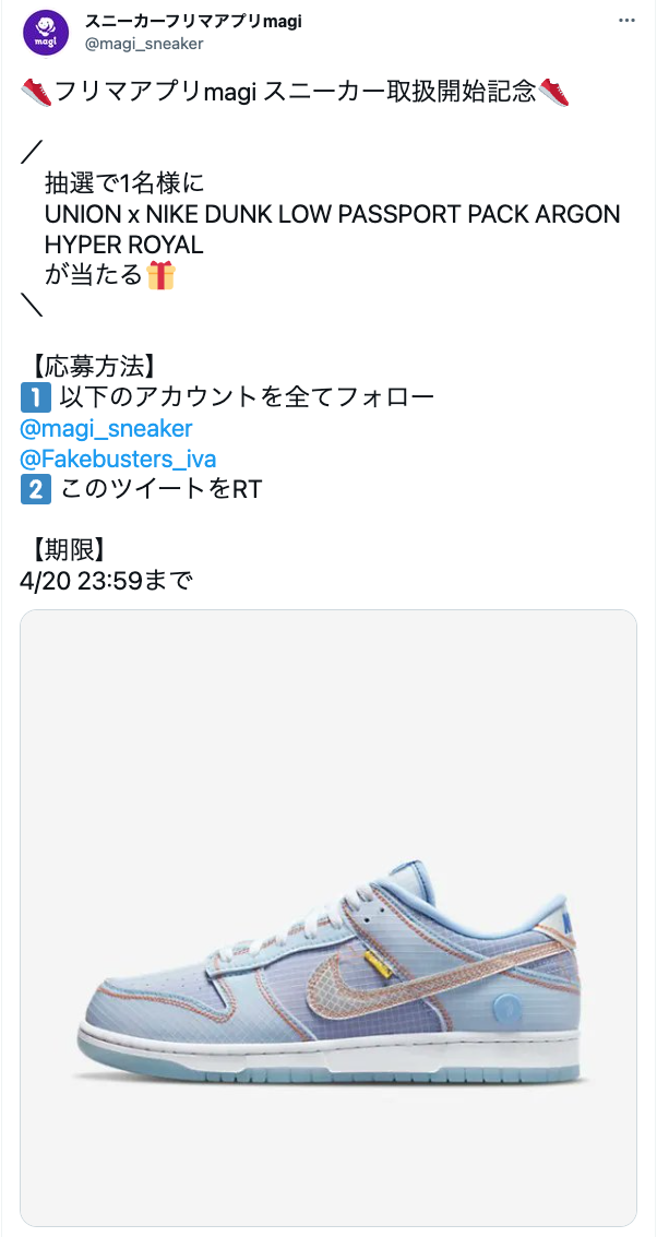 いつもmagiをご利用いただきありがとうございます! magi運営事務局でございます。 magi公式twitter(@magi_sneaker) において、 UNION x NIKE DUNK LOW PASSPORT PACK ARGON HYPER ROYALが当たるリツイートキャンペーンを実施中です! 奮ってご参加ください! 応募条件につきましては、以下画像をクリックしてTwitterに遷移し、ご確認ください。 ※画像をクリックするとtwitterに遷移します