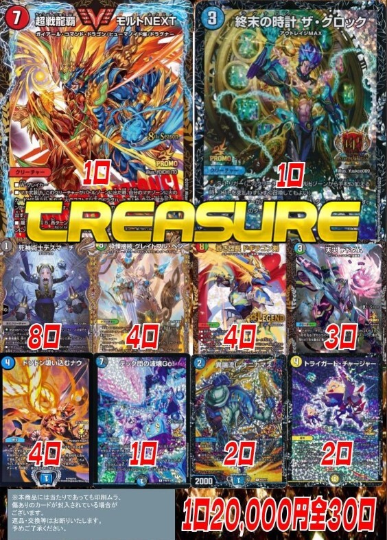 【⭐️magi秋葉原店の販売告知⭐️】 デュエマ新オリパ発売です🔥 TREASURE(トレジャー)オリパを販売します〜❣ 1口20,000円 全30口 全口公開型で大当たりは ・超戦龍覇モルトNEXT CSプロモ ・終末の時計ザ・クロック GPプロモ の2枚❣遊戯王新オリパ発売です🔥 女の子のレアカードがたくさん🥰 Girl's Oripa!!