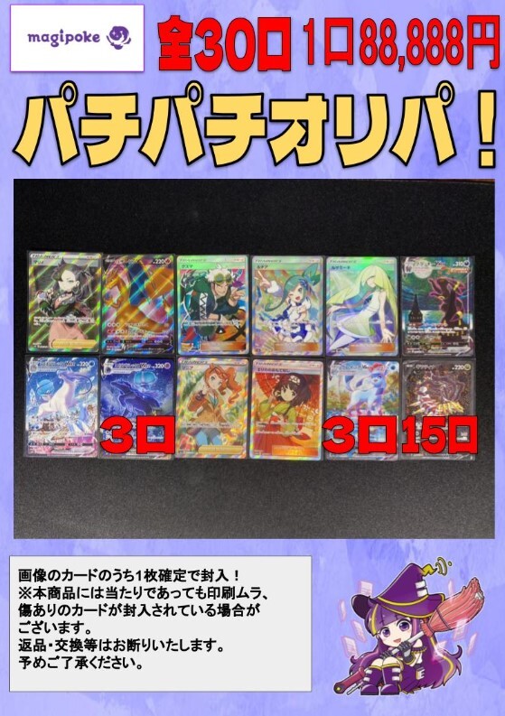 【⭐️magipoke渋谷モディ店の販売告知⭐️】 本日15時より販売開始のオリパのご案内です!! 全30口、1口88,888円! 👏パチパチオリパ!👏 内容過去一激アツな気がします🔥 28日までエポスカードでご購入いただくと10%オフで購入頂けます!