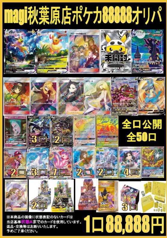 magi秋葉原店で全口公開のポケカ88888円オリパを販売開始!人気カードを多数当たり枠に封入しました!