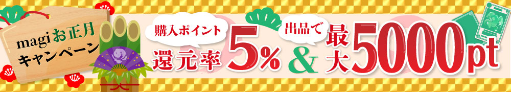 2019/12/26(木) 00:00から2020/1/3(金) 11:59までにmagiで購入した商品について、取引完了時の購入ポイントの還元率が取引価格の5%となります