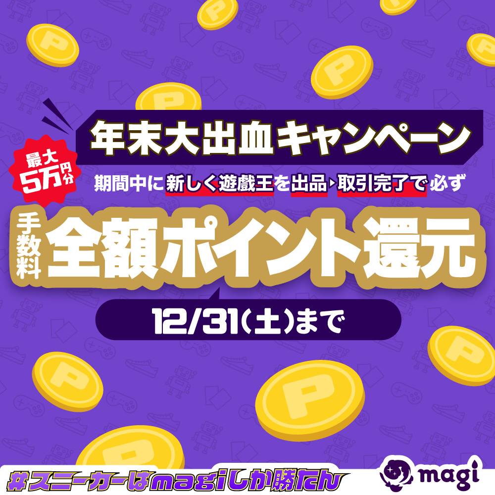 いつもmagiをご利用いただきありがとうございます! magi運営事務局でございます。 このたび以下のキャンペーンを実施いたします。■概要・参加条件 以下の条件を全て満たす商品を出品し売れた場合、取引手数料の全額をポイント還元いたします。 ・対象商品が「遊戯王」カテゴリーの商品であること ・キャンペーン期間中に新しく出品・購入され、取引が完了となった商品であること 以下キャンペーン参加申込フォームでの参加登録が必要となります。 キャンペーン参加申込フォームはこちら:https://forms.gle/jM2XTocNbDf3ETPr5 ■キャンペーン詳細 ・お一人様がもらえるポイントの上限は50,000ポイントです ・以下の様な出品はポイント付与対象外となり、事務局が悪質と判断した場合は、アカウントの停止などの対応をさせていただきます。 - 商品名、商品画像が正しく設定されていない出品 - 商品価格が相場から乖離した出品 - 商品名、商品画像からキャンペーン条件を満たすことが判別できない出品 - 実際の商品と異なるカテゴリ、ブランドへの出品 - 専用出品 - その他、事務局が不適切と判断した出品 ■キャンペーン期間 出品期限、申込フォームでの参加登録期限:2022/12/20(火)21:00〜2022/12/31(土)23:59 取引完了期限:2023/1/22(日)23:59 還元ポイントを付与する日程は2023年1月下旬を予定しております。 ■その他注意事項 ・不正行為、複数アカウントを用いてポイントを受け取るために架空の出品や、実際の取引を装った手渡しでの知人間、親族間での取引、同一ユーザー間での不自然な連続した取引などの運営上の趣旨に反していると弊社が判断した行為が行われた場合はポイント付与対象外とし、アカウントの停止などの対応をさせていただきます。 ・キャンペーンへの参加を目的とした、売却意思のない出品や在庫がない商品の出品は付与対象外とし、アカウントの停止などの対応をさせていただきます。 ・キャンペーン期間前に既に出品されていた商品情報を編集した場合は出品とはみなされないためご注意ください。 ・ポイント付与時点で、退会されているお客様のポイント、また利用規約違反の商品に関するポイントは付与対象外となります。 ・magiポイントは1ポイント=1円として1ポイントからmagiでの購入に利用できるもので、有効期限は付与日から150日間です。 ・本キャンペーンは予告なく変更・中止する場合がございます。 ・本キャンペーンは株式会社ジラフ「magi」が主催しているものです。 ご不明点などございましたら、お問い合わせよりご連絡ください。 お問い合わせは、アプリ左上メニュー→「お問い合わせ」からご利用いただけます。 引き続き、magiをよろしくお願いいたします。