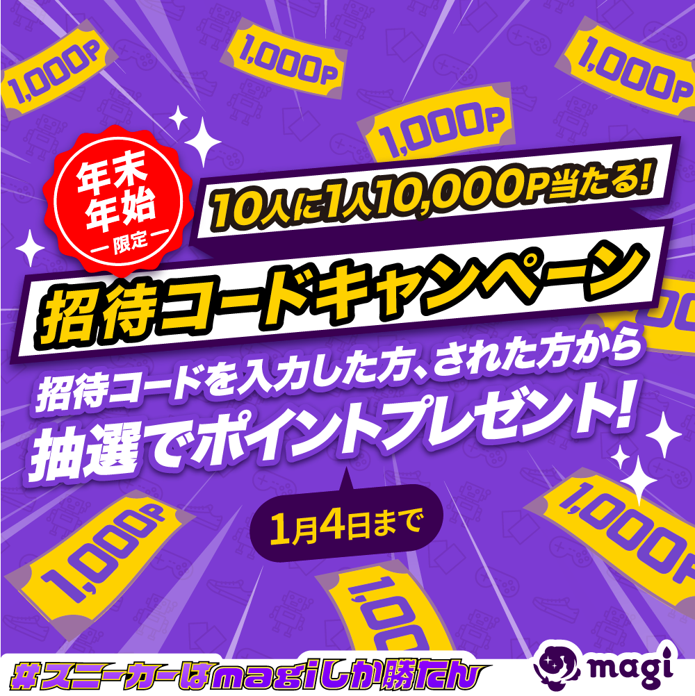 期間中にmagiの招待コードを入力した方・された方の中から抽選で、magiで使える10,000ポイントをプレゼントいたします。