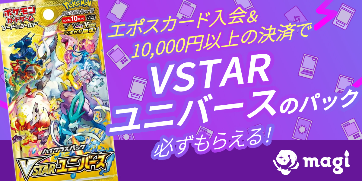 期間中、magi経由でエポスカードにご入会いただき、magiにおいてエポスかんたん決済で10,000円以上のお支払いをされた方に、ポケモンカードゲーム「VSTARユニバース」の未開封パックをプレゼントいたします。