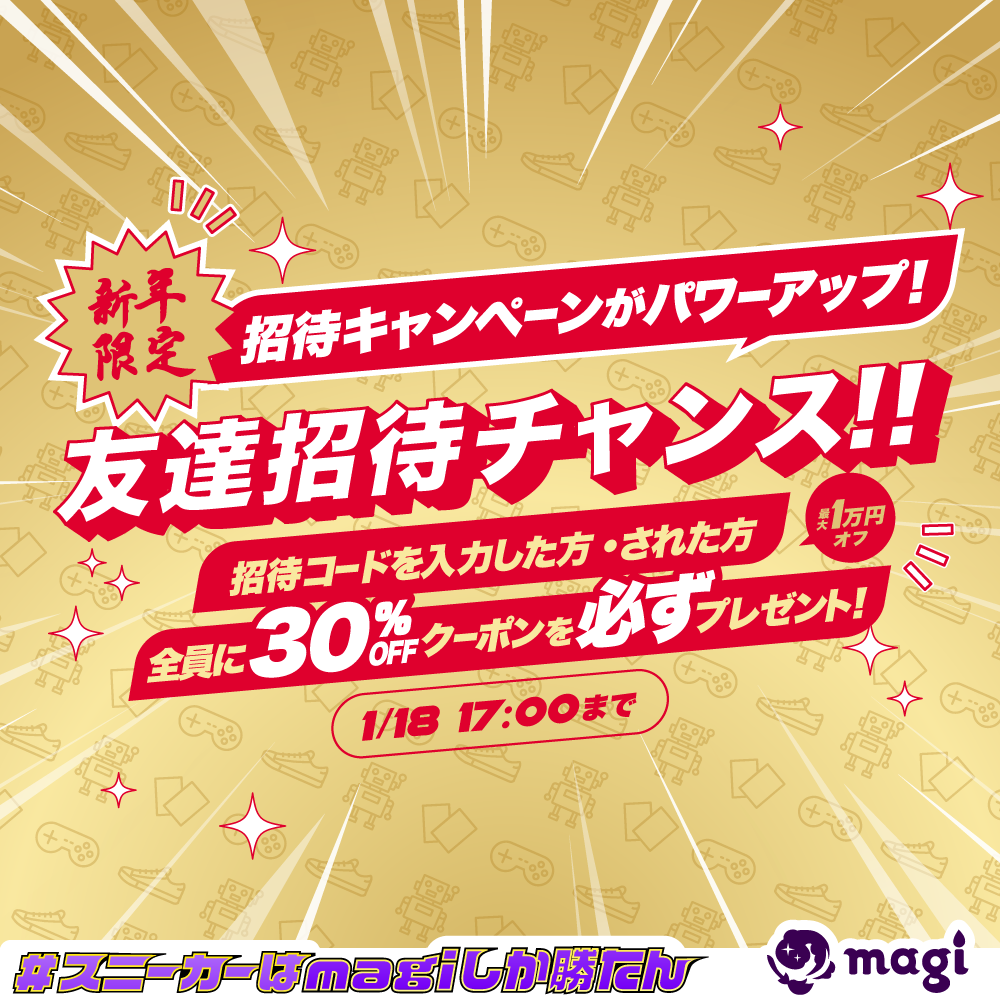 いつもmagiをご利用いただきありがとうございます! magi運営事務局でございます。 このたび、以下の内容のキャンペーンを実施いたします。========================== ■キャンペーン概要 期間中にmagiの招待コードを入力した方・された方に付与されるクーポンの内容が「30%OFFクーポン(最大10,000円OFF)」となります。 ■参加方法 期間中の全ての招待コードの入力が対象となります。 ■キャンペーン期間 期間:2023/1/11(水)17:00〜2023/1/18(水)17:00 ・招待コードの確認、入力は「設定」→「招待コード確認」より可能です。 ・招待コードのご入力は1アカウントあたり1回かつ会員登録から7日間のみ可能となります。すでに招待コードを入力しているお客様は本キャンペーンで招待コードを入力することはできません。 ・招待コードによってもらえるクーポンの有効期間は10日間となります。 ・招待コードのご入力には電話番号認証が必要となっております。電話番号認証が可能な端末および電話番号をお持ちでないお客様は本キャンペーンで招待コードを発行・入力することはできません。 ※注意事項※ ・不正行為、複数アカウントを用いてクーポンを受け取るための行為や、実際の取引を装った手渡しでの知人間、親族間での取引などの運営上の趣旨に反していると弊社が判断した行為が行われた場合は付与対象外とし、アカウントの停止などの対応をさせていただきます。 ・招待コードの発行、入力はアプリ版でのみ可能となっております。Webサイトから参加することはできません。 ・本キャンペーンは予告なく変更・中止する場合がございます。 ・本キャンペーンは株式会社ジラフ「magi」が主催しているものです。 ================================== ご不明点などございましたら、お問い合わせよりご連絡ください。 お問い合わせは、アプリ左上メニュー→「お問い合わせ」からご利用いただけます。 引き続き、magiをよろしくお願い致します。