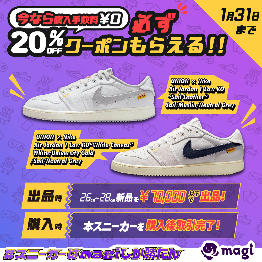 いつもmagiをご利用いただきありがとうございます! magi運営事務局でございます。 このたび以下のキャンペーンを実施いたします。■概要・参加条件 以下のいずれかの参加条件を満たした方に、20%OFFクーポン1枚をプレゼントいたします。 - 出品での参加条件 ・キャンペーン期間中に70,000円以下の価格で以下のいずれかのスニーカーを出品すること 「UNION × Nike Air Jordan 1 Low KO “Sail Leather” Sail/Muslin/Neutral Grey(DZ4864-100)」 「UNION × Nike Air Jordan 1 Low KO “White Canvas” White/Sail/University Gold/Neutral Grey(DO8912-101)」 ・サイズは26cm〜28cmのみ、状態は新品のみを対象とします - 購入での参加条件 ・キャンペーン期間中に以下のいずれかのスニーカーを購入し、取引が完了となること 「UNION × Nike Air Jordan 1 Low KO “Sail Leather” Sail/Muslin/Neutral Grey(DZ4864-100)」 「UNION × Nike Air Jordan 1 Low KO “White Canvas” White/Sail/University Gold/Neutral Grey(DO8912-101)」 以下キャンペーン参加申込フォームでの参加登録が必要となります。 キャンペーン参加申込フォームはこちら:https://forms.gle/o58jrK6ZYCXoJVKE8 ■キャンペーン詳細 ・お一人様がもらえるクーポン枚数の上限は1枚です。 ・付与されるクーポンは割引上限金額10,000円、利用期間は付与から10日間となります。 ・以下の様な出品はポイント付与対象外となり、事務局が悪質と判断した場合は、アカウントの停止などの対応をさせていただきます。 - 商品名、商品画像が正しく設定されていない出品 - 同一商品の重複した出品 - 商品価格が相場から乖離した出品 - 商品名、商品画像からキャンペーン条件を満たすことが判別できない出品 - 実際の商品と異なるカテゴリ、ブランドへの出品 - 専用出品 - その他、事務局が不適切と判断した出品 ■キャンペーン期間 出品・購入期限、申込フォームでの参加登録期限:2023/1/27(木)17:00〜2023/1/31(火)23:59 取引完了期限:2023/2/19(日)23:59 クーポンを付与する日程は2023年2月下旬を予定しております。 ■その他注意事項 ・不正行為、複数アカウントを用いてポイントを受け取るために架空の出品や、実際の取引を装った手渡しでの知人間、親族間での取引、同一ユーザー間での不自然な連続した取引などの運営上の趣旨に反していると弊社が判断した行為が行われた場合はポイント付与対象外とし、アカウントの停止などの対応をさせていただきます。 ・キャンペーンへの参加を目的とした、売却意思のない出品や在庫がない商品の出品は付与対象外とし、アカウントの停止などの対応をさせていただきます。 ・キャンペーン期間前に既に出品されていた商品情報を編集した場合は出品とはみなされないためご注意ください。 ・ポイント付与時点で、退会されているお客様のポイント、また利用規約違反の商品に関するポイントは付与対象外となります。 ・magiポイントは1ポイント=1円として1ポイントからmagiでの購入に利用できるもので、有効期限は付与日から150日間です。 ・本キャンペーンは予告なく変更・中止する場合がございます。 ・本キャンペーンは株式会社ジラフ「magi」が主催しているものです。 ご不明点などございましたら、お問い合わせよりご連絡ください。 お問い合わせは、アプリ左上メニュー→「お問い合わせ」からご利用いただけます。 引き続き、magiをよろしくお願いいたします。