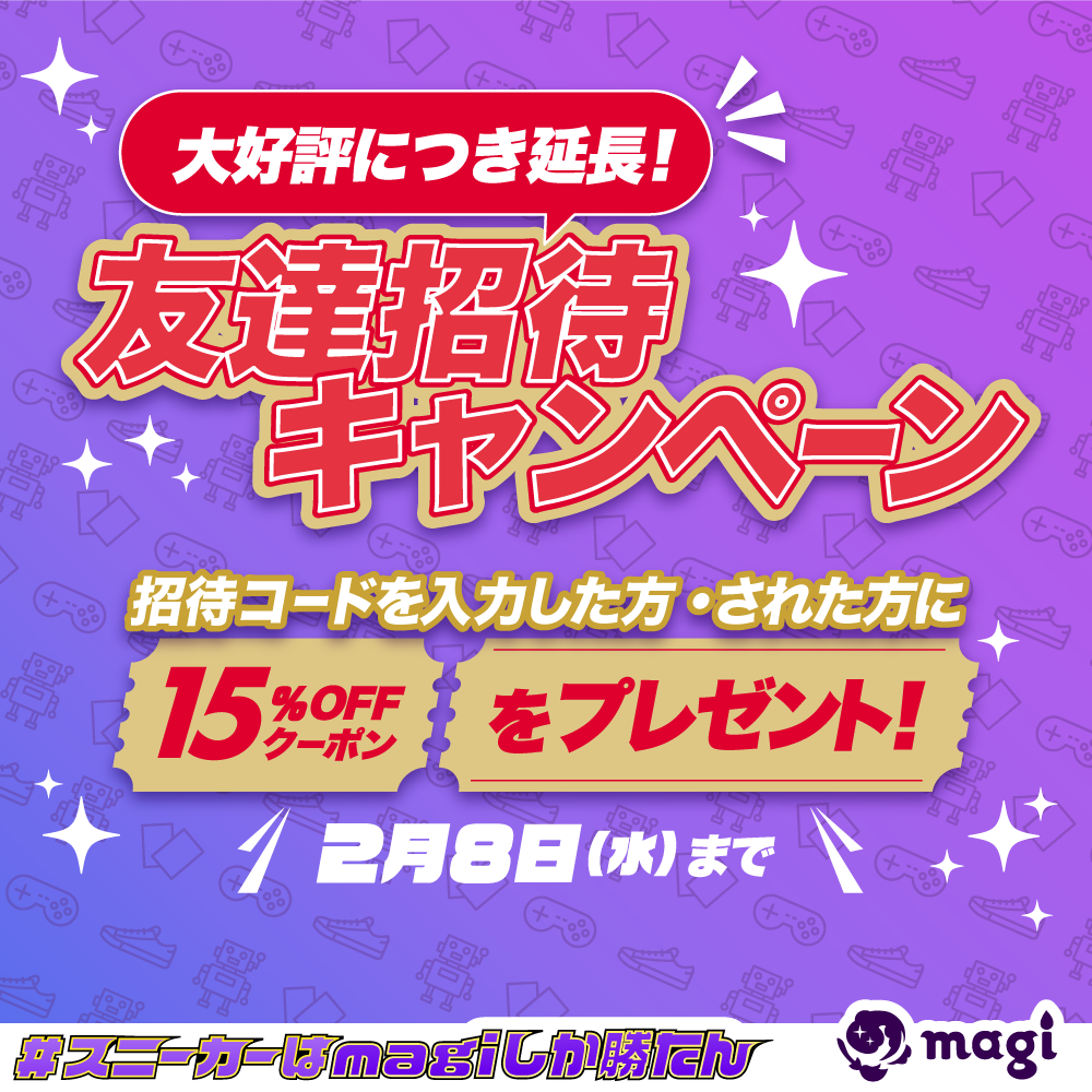 期間中にmagiの招待コードを入力した方・された方に付与されるクーポンの内容が「15%OFFクーポン(最大7,500円OFF)」となります。
