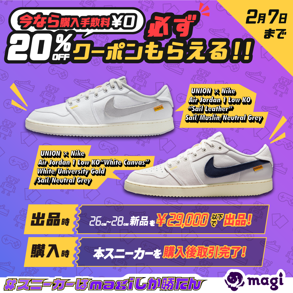 いつもmagiをご利用いただきありがとうございます! magi運営事務局でございます。 このたび以下のキャンペーンを実施いたします。■概要・参加条件 以下のいずれかの参加条件を満たした方に、20%OFFクーポン1枚をプレゼントいたします。 - 出品での参加条件 ・キャンペーン期間中に29,000円以下の価格で以下のいずれかのスニーカーを出品すること 「UNION × Nike Air Jordan 1 Low KO “Sail Leather” Sail/Muslin/Neutral Grey(DZ4864-100)」 「UNION × Nike Air Jordan 1 Low KO “White Canvas” White/Sail/University Gold/Neutral Grey(DO8912-101)」 ・サイズは26cm〜28cmのみ、状態は新品のみを対象とします - 購入での参加条件 ・キャンペーン期間中に以下のいずれかのスニーカーを購入し、取引が完了となること 「UNION × Nike Air Jordan 1 Low KO “Sail Leather” Sail/Muslin/Neutral Grey(DZ4864-100)」 「UNION × Nike Air Jordan 1 Low KO “White Canvas” White/Sail/University Gold/Neutral Grey(DO8912-101)」 以下キャンペーン参加申込フォームでの参加登録が必要となります。 キャンペーン参加申込フォームはこちら:https://forms.gle/4sYQbvNM7MpZi5un7 ■キャンペーン詳細 ・お一人様がもらえるクーポン枚数の上限は1枚です。 ・付与されるクーポンは割引上限金額10,000円、利用期間は付与から10日間となります。 ・以下の様な出品はポイント付与対象外となり、事務局が悪質と判断した場合は、アカウントの停止などの対応をさせていただきます。 - 商品名、商品画像が正しく設定されていない出品 - 同一商品の重複した出品 - 商品価格が相場から乖離した出品 - 商品名、商品画像からキャンペーン条件を満たすことが判別できない出品 - 実際の商品と異なるカテゴリ、ブランドへの出品 - 専用出品 - その他、事務局が不適切と判断した出品 ■キャンペーン期間 出品・購入期限、申込フォームでの参加登録期限:2023/2/3(金)18:00〜2023/2/7(火)23:59 取引完了期限:2023/2/26(日)23:59 クーポンを付与する日程は2023年3月上旬を予定しております。 ■その他注意事項 ・不正行為、複数アカウントを用いてポイントを受け取るために架空の出品や、実際の取引を装った手渡しでの知人間、親族間での取引、同一ユーザー間での不自然な連続した取引などの運営上の趣旨に反していると弊社が判断した行為が行われた場合はポイント付与対象外とし、アカウントの停止などの対応をさせていただきます。 ・キャンペーンへの参加を目的とした、売却意思のない出品や在庫がない商品の出品は付与対象外とし、アカウントの停止などの対応をさせていただきます。 ・キャンペーン期間前に既に出品されていた商品情報を編集した場合は出品とはみなされないためご注意ください。 ・ポイント付与時点で、退会されているお客様のポイント、また利用規約違反の商品に関するポイントは付与対象外となります。 ・magiポイントは1ポイント=1円として1ポイントからmagiでの購入に利用できるもので、有効期限は付与日から150日間です。 ・本キャンペーンは予告なく変更・中止する場合がございます。 ・本キャンペーンは株式会社ジラフ「magi」が主催しているものです。 ご不明点などございましたら、お問い合わせよりご連絡ください。 お問い合わせは、アプリ左上メニュー→「お問い合わせ」からご利用いただけます。 引き続き、magiをよろしくお願いいたします。